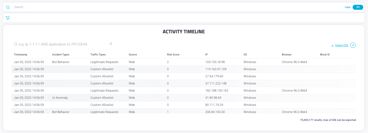 Search example: Traffic type: Legitimate Requests AND (ip: 27.62.247.167 OR IP: 1.64.71.81)
