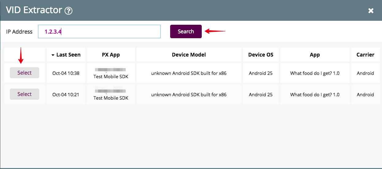 This will launch the <glossary:VID>Extractor model: - Insert your IP address and click Search. This locates all <glossary:VID>s for your APP ID.