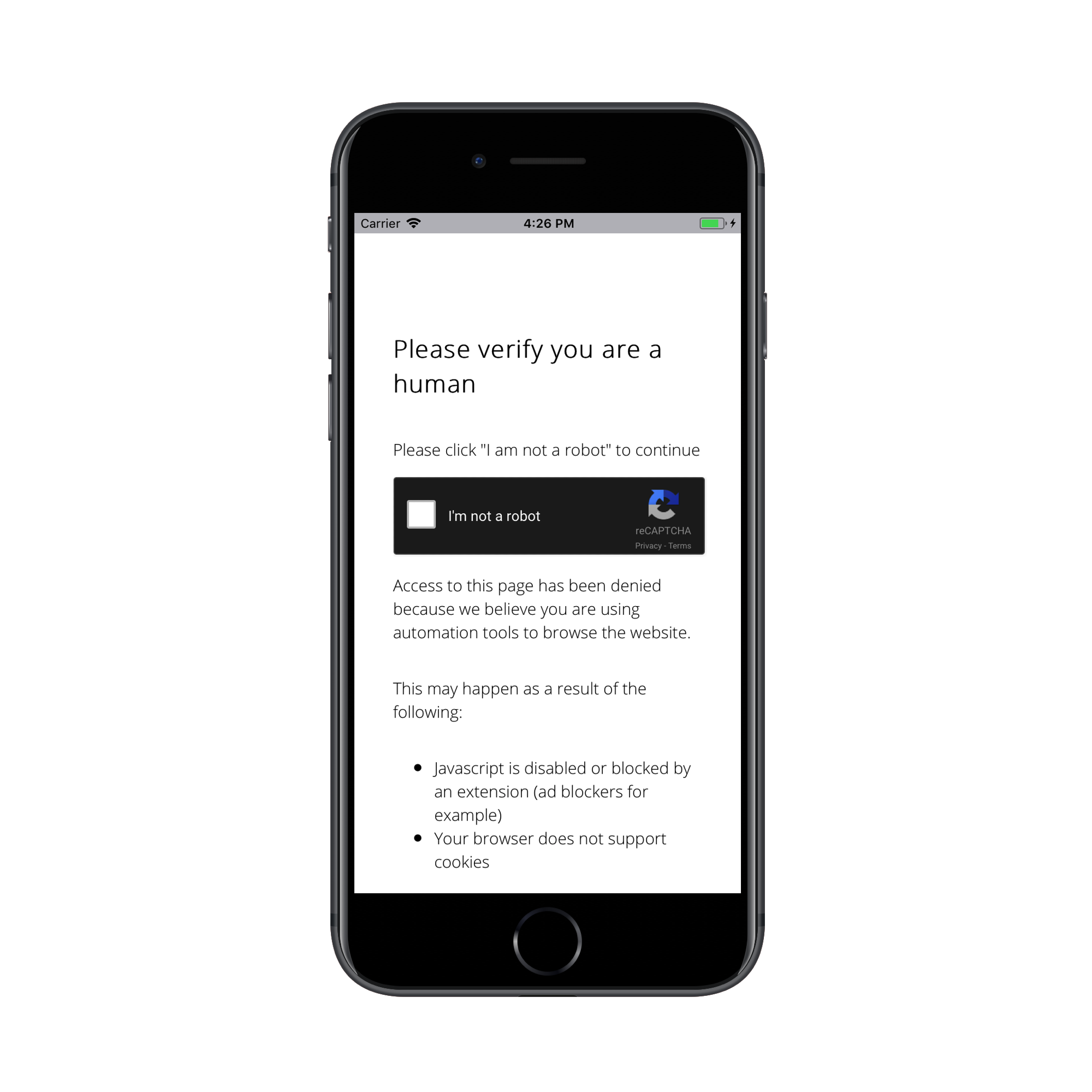 When a HTTP request is denied by HUMAN a 403 response code is sent in the HTTP response along with a JSON body encoded as a UTF-8 that is parsed and used by the HUMAN iOS SDK. The parsed JSON is then used to render a WebView to either challenge (with CAPTCHA) the visitor, or block the visitor from continuing in the application. If the user solves the presented challenge they will return to the application. If the user fails the CAPTCHA challenge they continue to be challenged until they pass the verification screen.