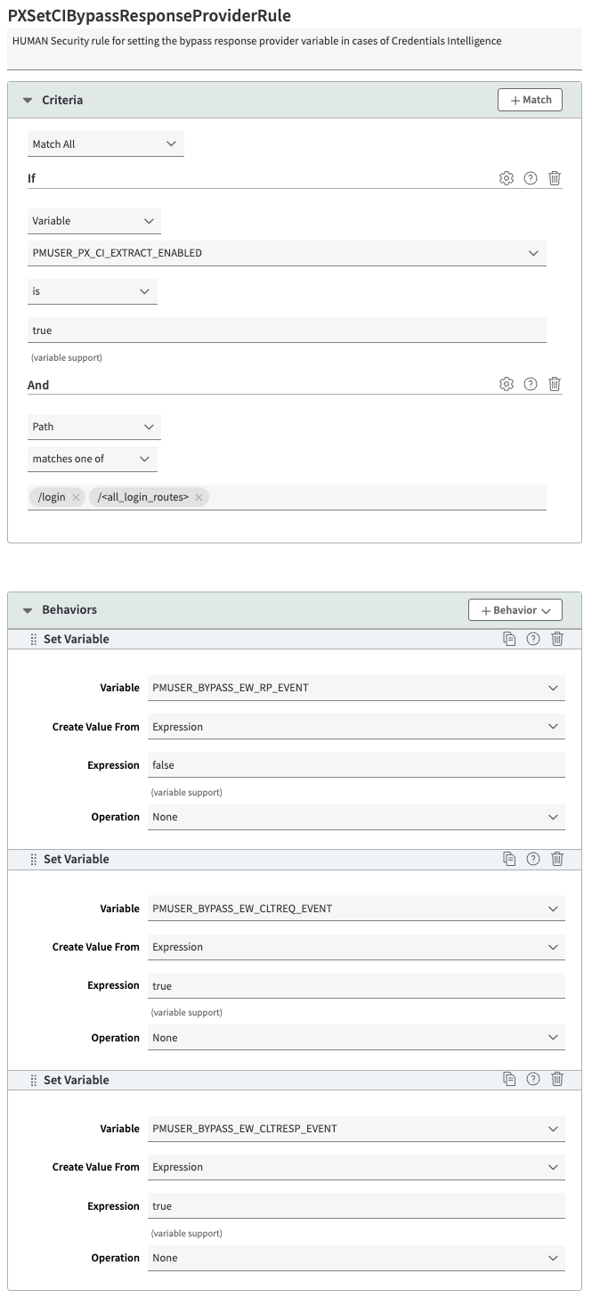 HUMAN Security rule for setting the bypass response provider variable in cases of Credentials Intelligence. To create this rule: