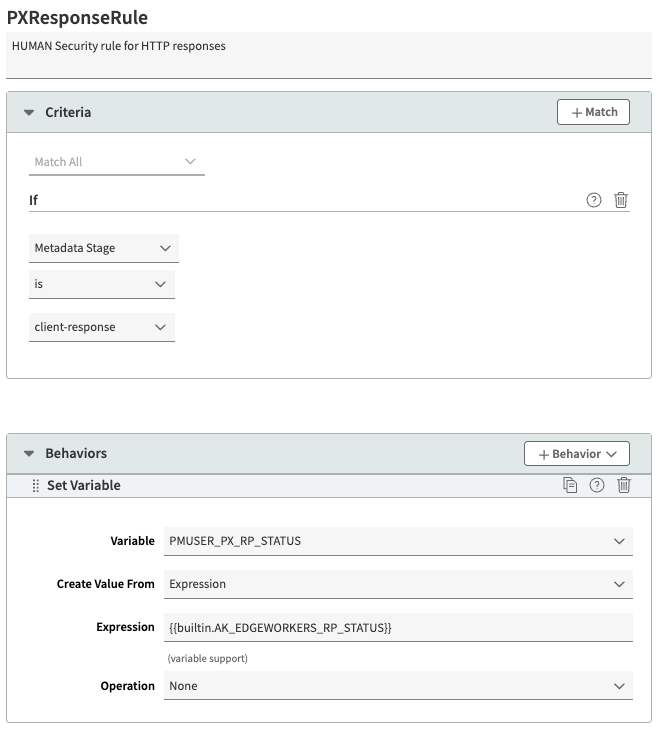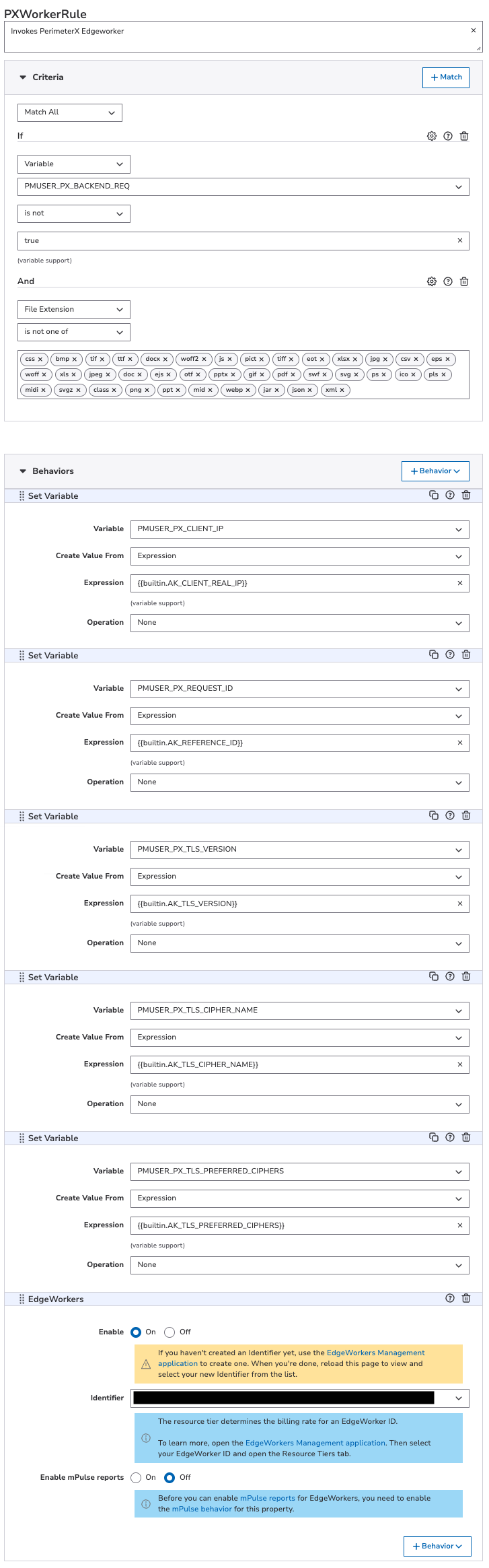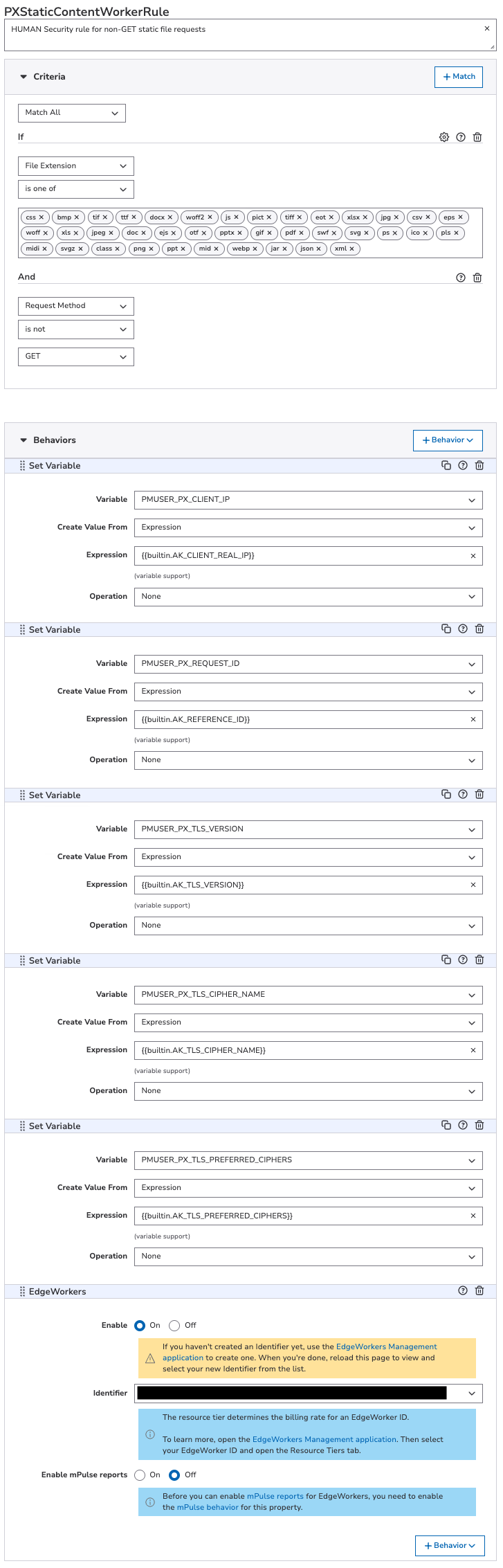 Setting up the Property Manager requires adding Property Manager Variables to configure the HUMAN EdgeWorker Enforcer and Property Manager Rules to trigger the HUMAN EdgeWorker Enforcer.