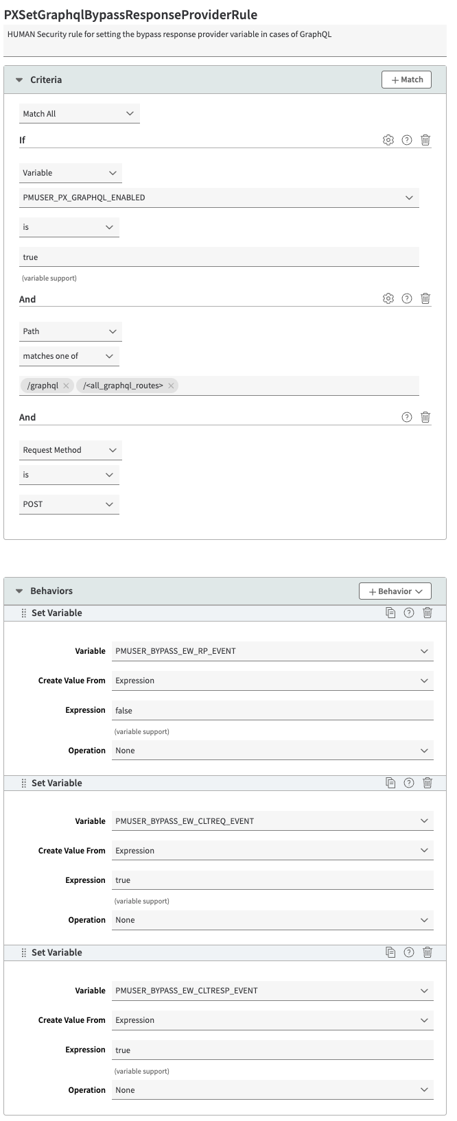 HUMAN Security rule for setting the bypass response provider variable in cases of GraphQL. To create this rule: