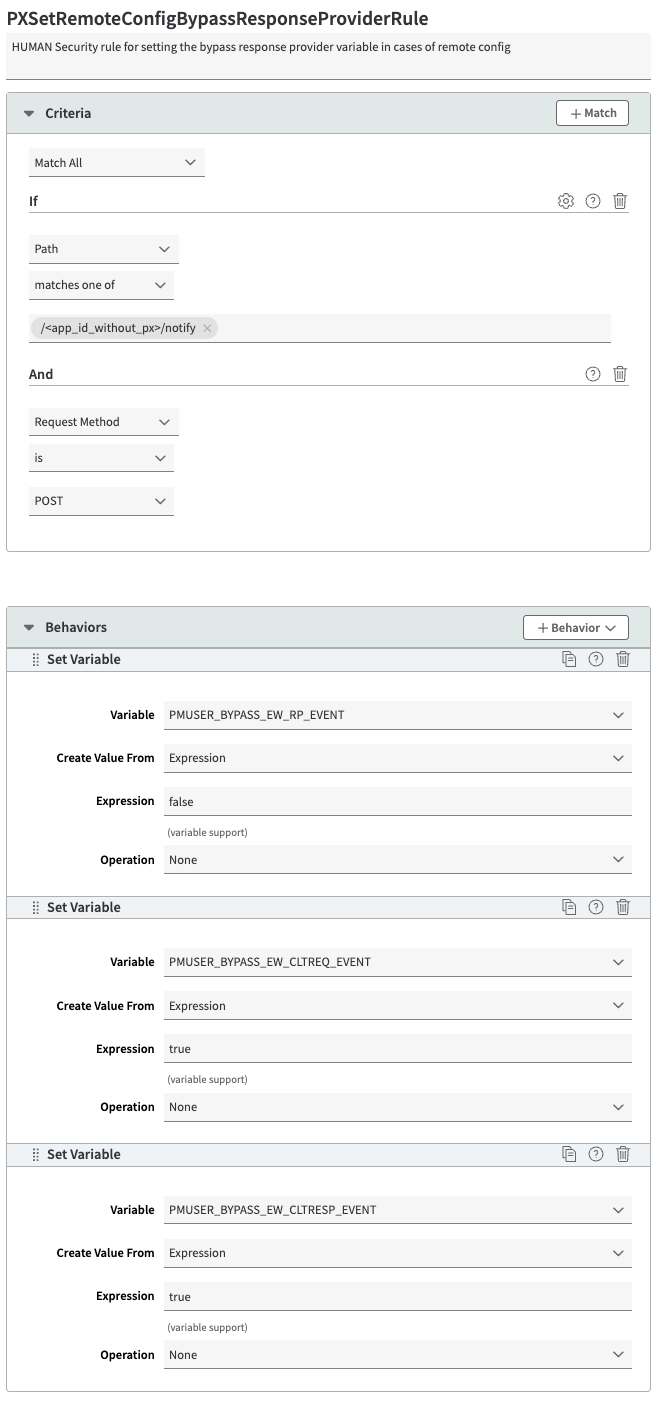 HUMAN Security rule for setting the bypass response provider variable in cases of remote config. To create this rule: