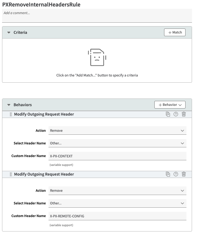 - In the Criteria section, select Match Any so that any of the criteria may be met to trigger the behaviors. Select + Match and add the following 2 criteria: