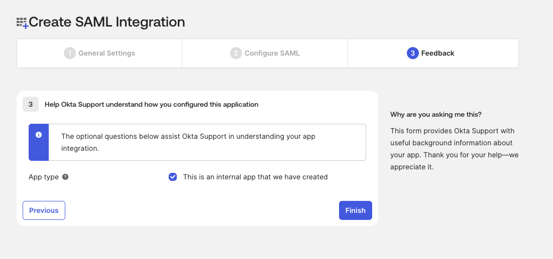 - In Feedback, select the App type option This is an internal app that we have created. Then, click Finish.
