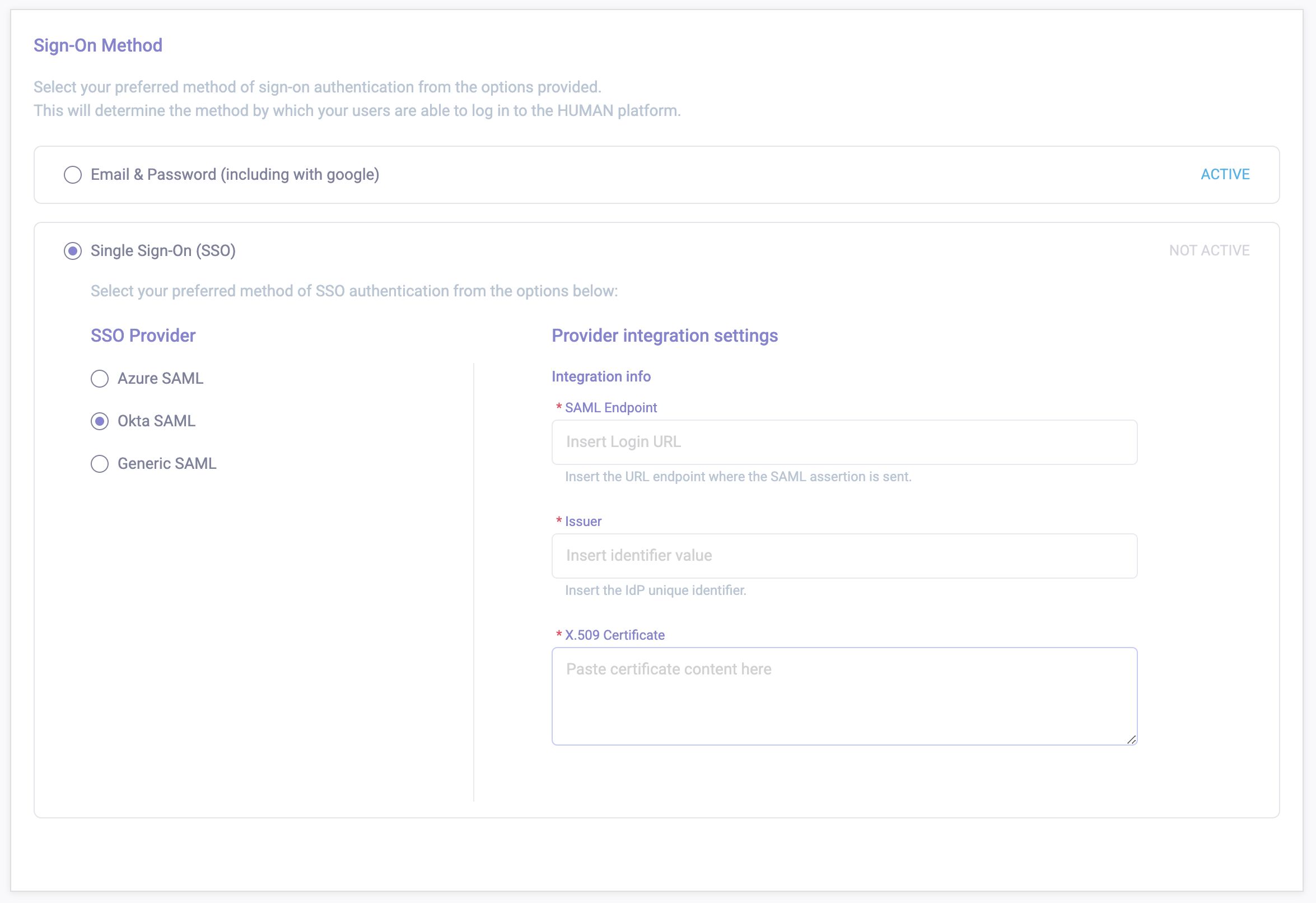 - In the HUMAN Portal tab, paste the values SAML Endpoint, Issuer and X.509 Certificate.