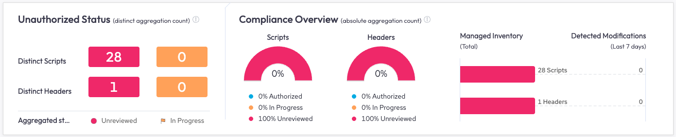 - Unauthorized Status: Shows the number of unauthorized scripts and headers in your selected application and host domains. These counts are distinct, meaning that even if the same script appears in two or more of your selected applications or host domains, PCI DSS only counts it once here.