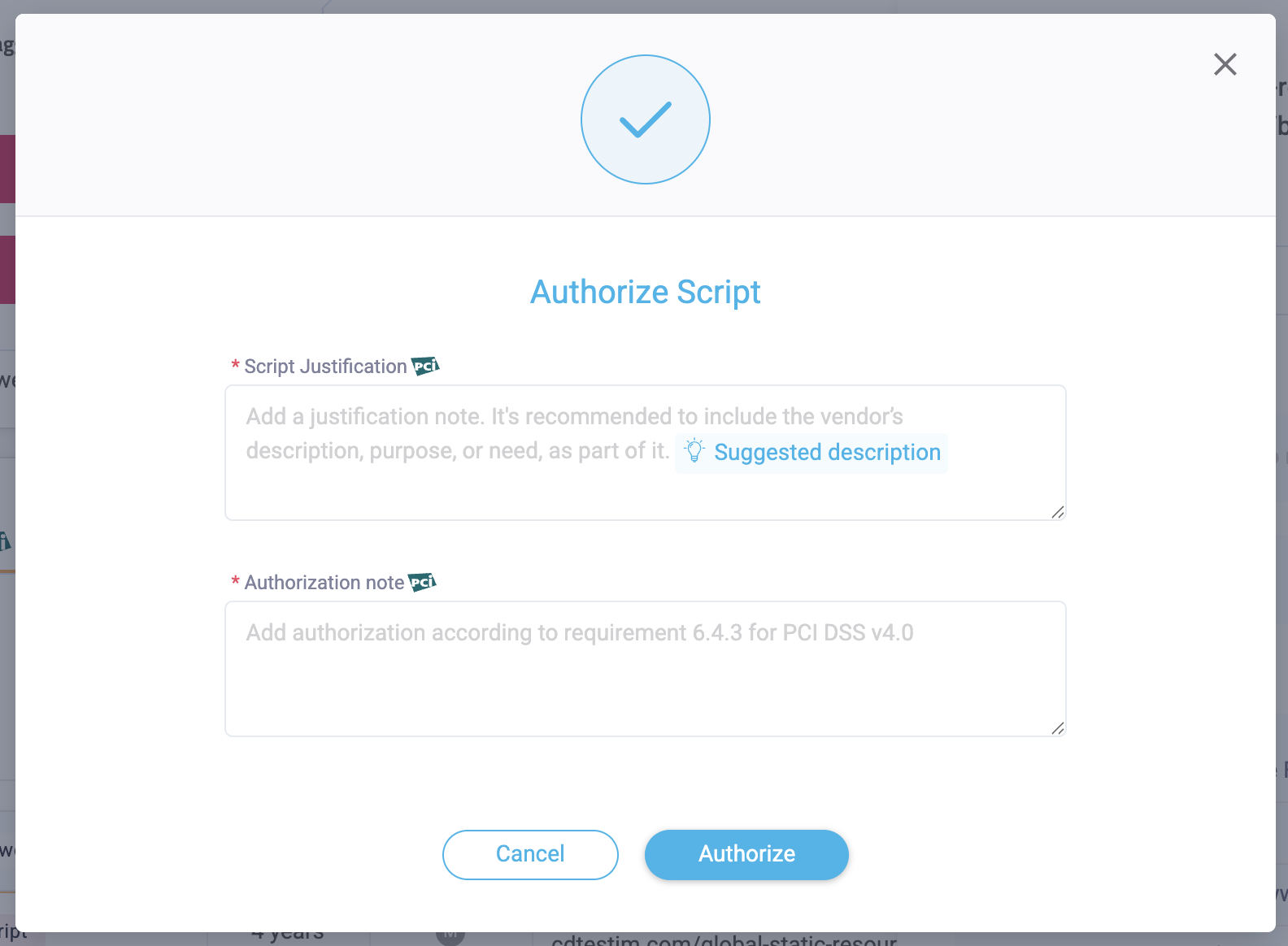 If you have the PCI Authorizer role, you are only able to Authorize scripts and add an Authorization note, but cannot justify scripts. After you authorize, if justification has not yet been provided, the script will move to the pending justification status for the PCI Justifier role to review. See Role permissions for more information.