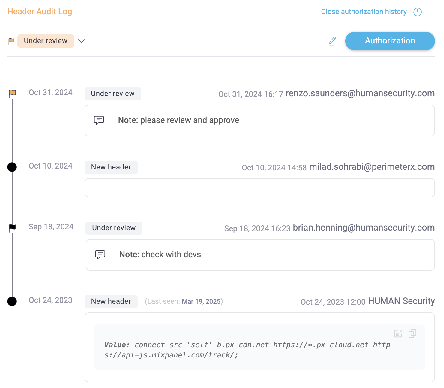 - Show authorization history: Click to display the header’s audit log and add notes.