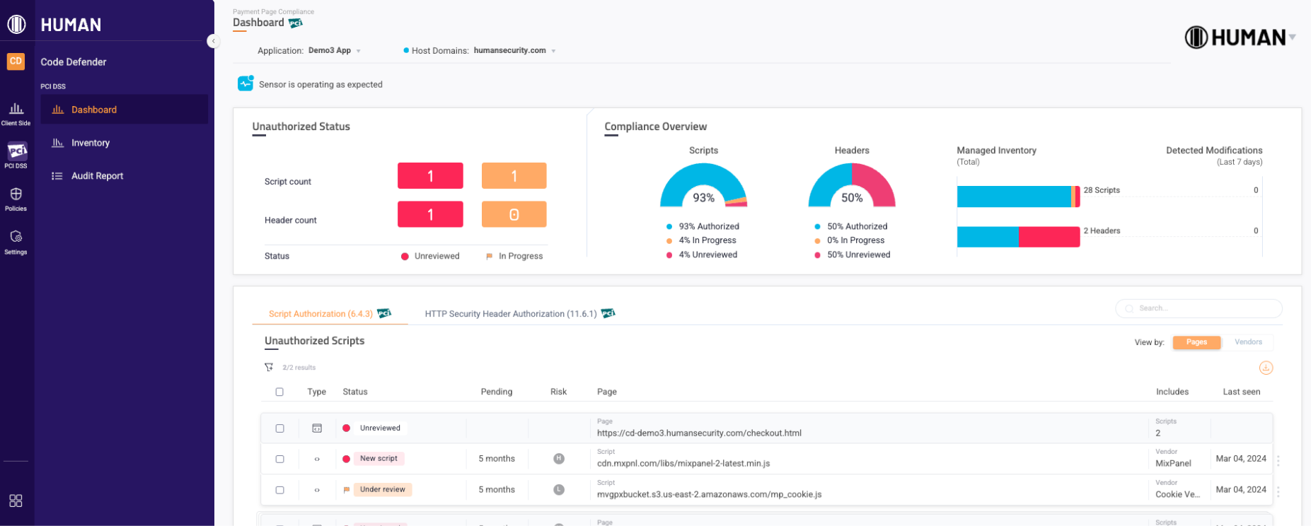 The PCI DSS Dashboard inventory is determined by the scripts tracked in your payment pages. When you first start using PCI DSS, the Pages Inventory displays pages it determines are likely to be your payment pages. Be sure to check these pages for accuracy so the HUMAN team can remove or add any URLs as needed.