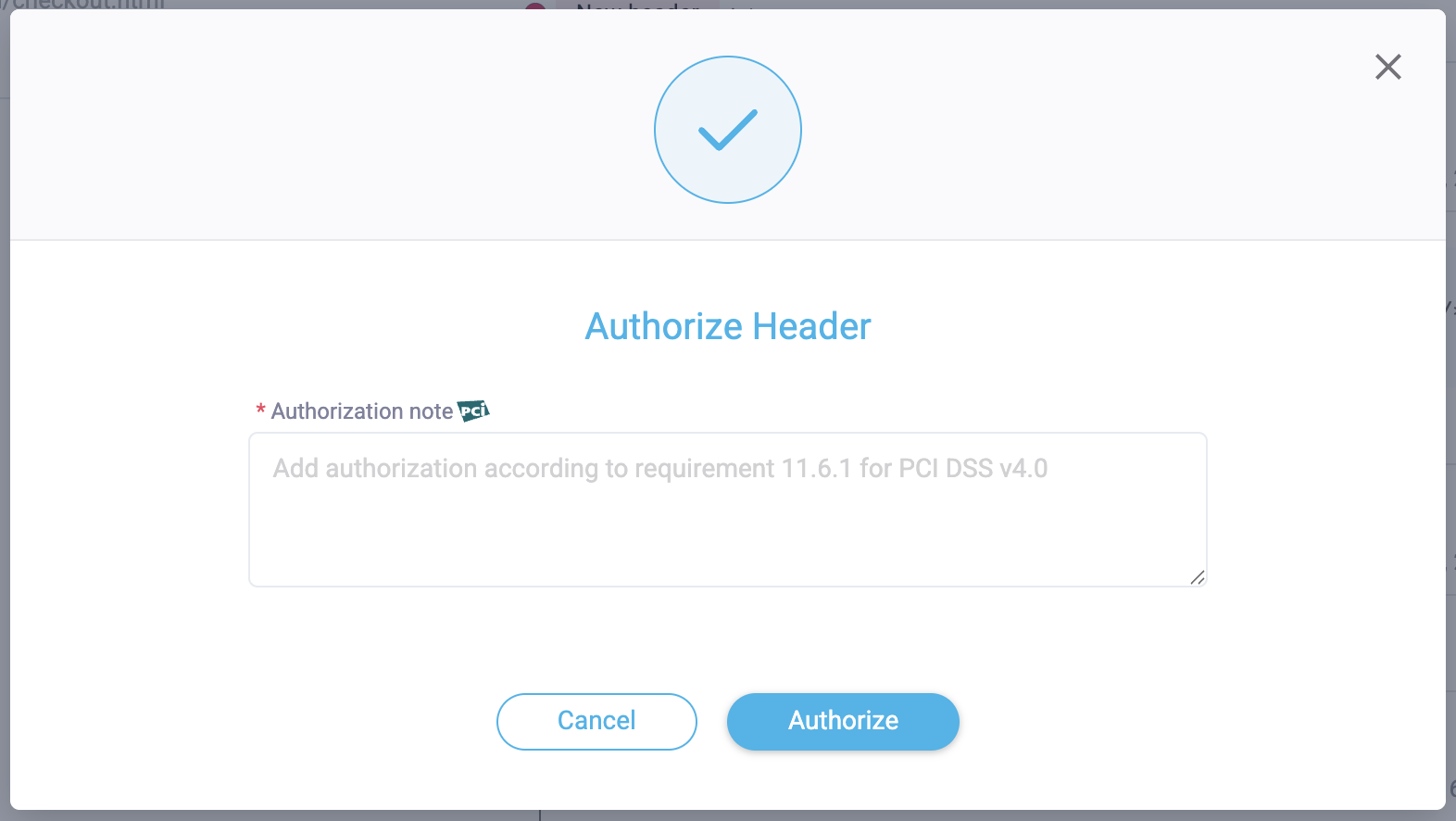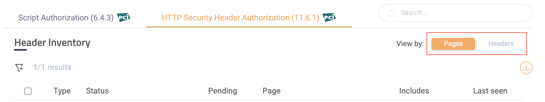 - The HTTP Security Header Authorization tab: This displays HTTP headers that need your review. Only unauthorized headers are shown, which are any headers that are not authorized or archived. The headers in these latter states are excluded from this tab, but you can always check for a full list of headers from the PCI DSS Inventory.