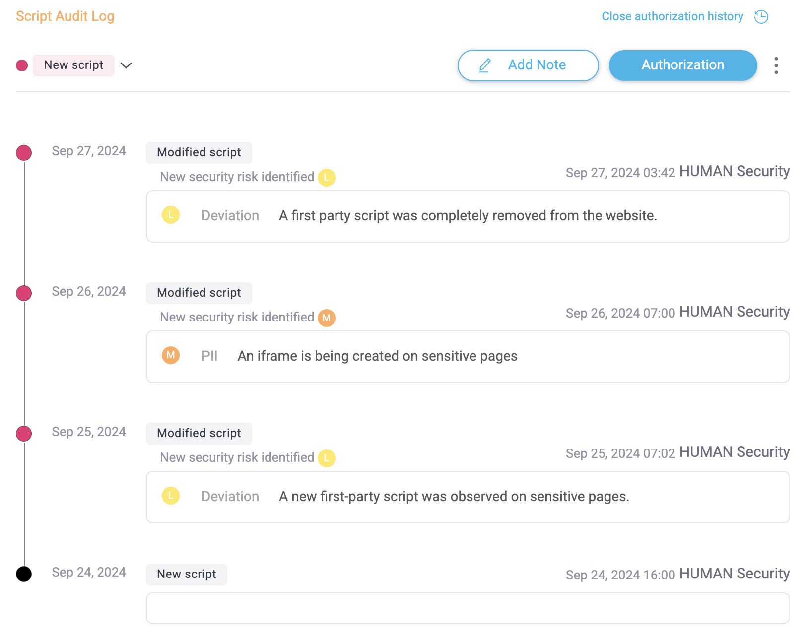 - Show authorization history: Click to display the script’s audit log, add notes, or authorize the script.