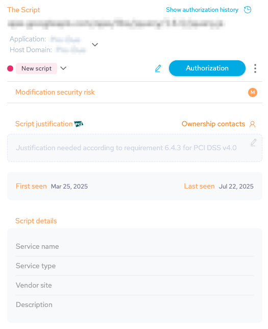 - The Script Authorization tab: This displays scripts that need your review. Only unauthorized scripts are shown, which are any scripts that are not authorized or archived. The scripts in these latter states are excluded from this tab, but you can always check for a full list of scripts from the PCI DSS Inventory.