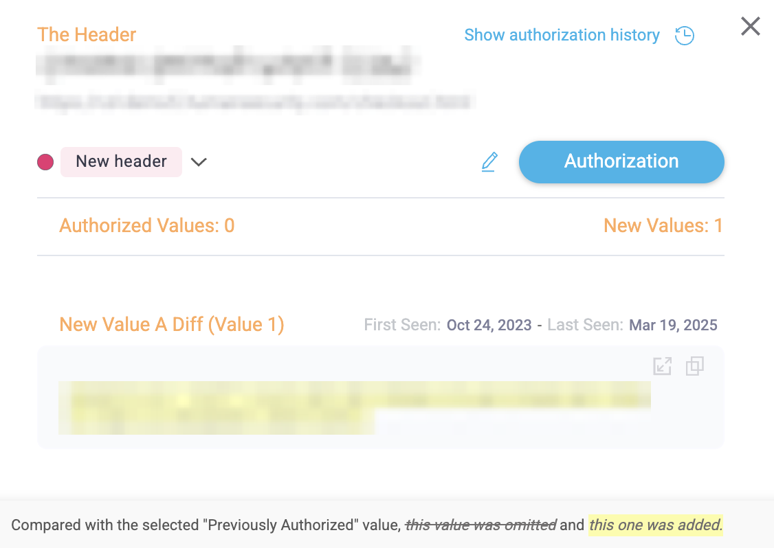 - Compare header values: Open a new view to compare the selected new header value with any previously authorized header value.