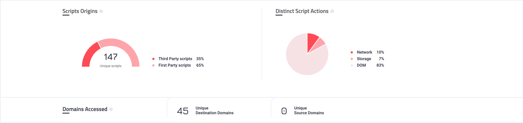 - Distinct Script Actions - A graph that represents the percentage of scripts actions (DOM, Network, Storage)