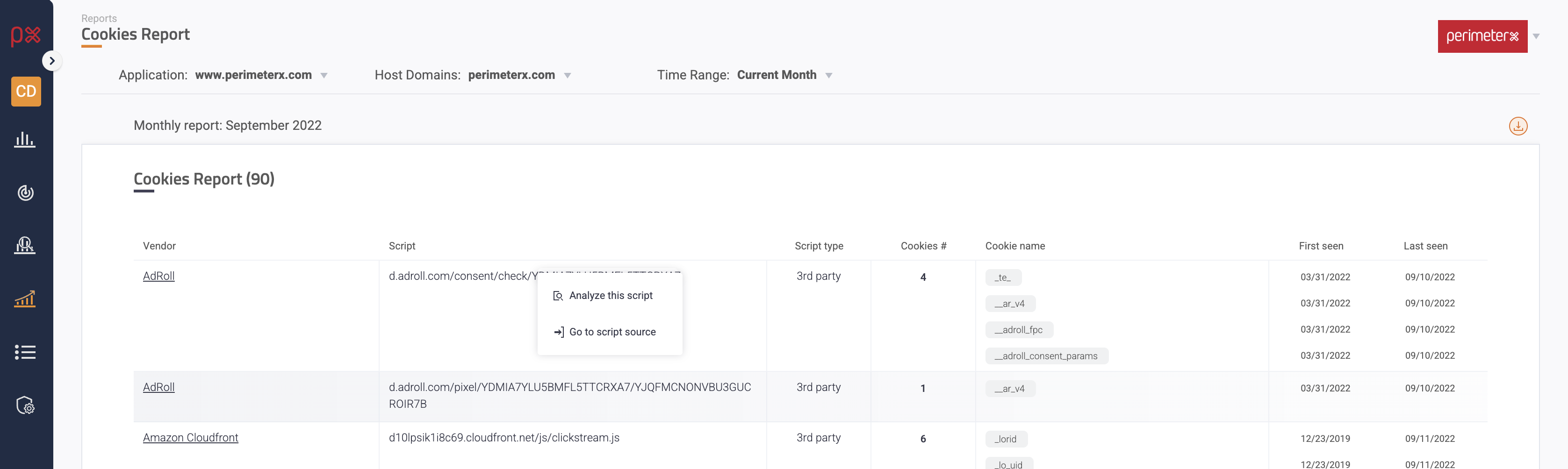 This view shows the full list of cookies that were observed during the selected month, for a given application/host domain. The list will include all the cookies which were active during the month, meaning were first seen prior to or during the selected month and were last seen during the selected month.