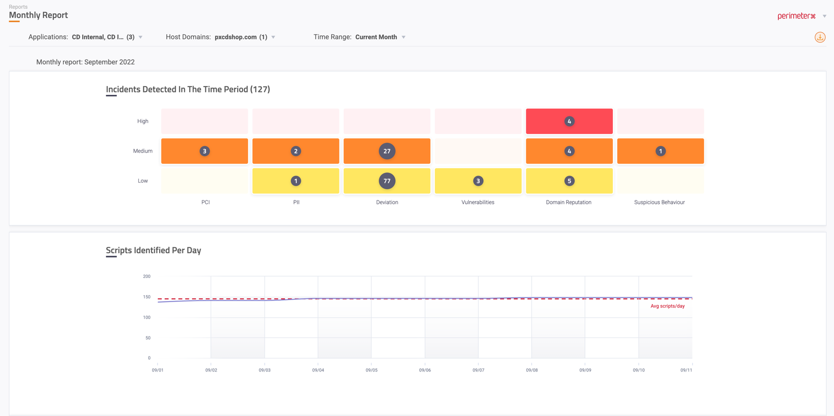 - Scripts identified per day - A graph that presents the number of scripts the sensor observed per day in the month. This graph can help follow rollouts and production changes in the website.