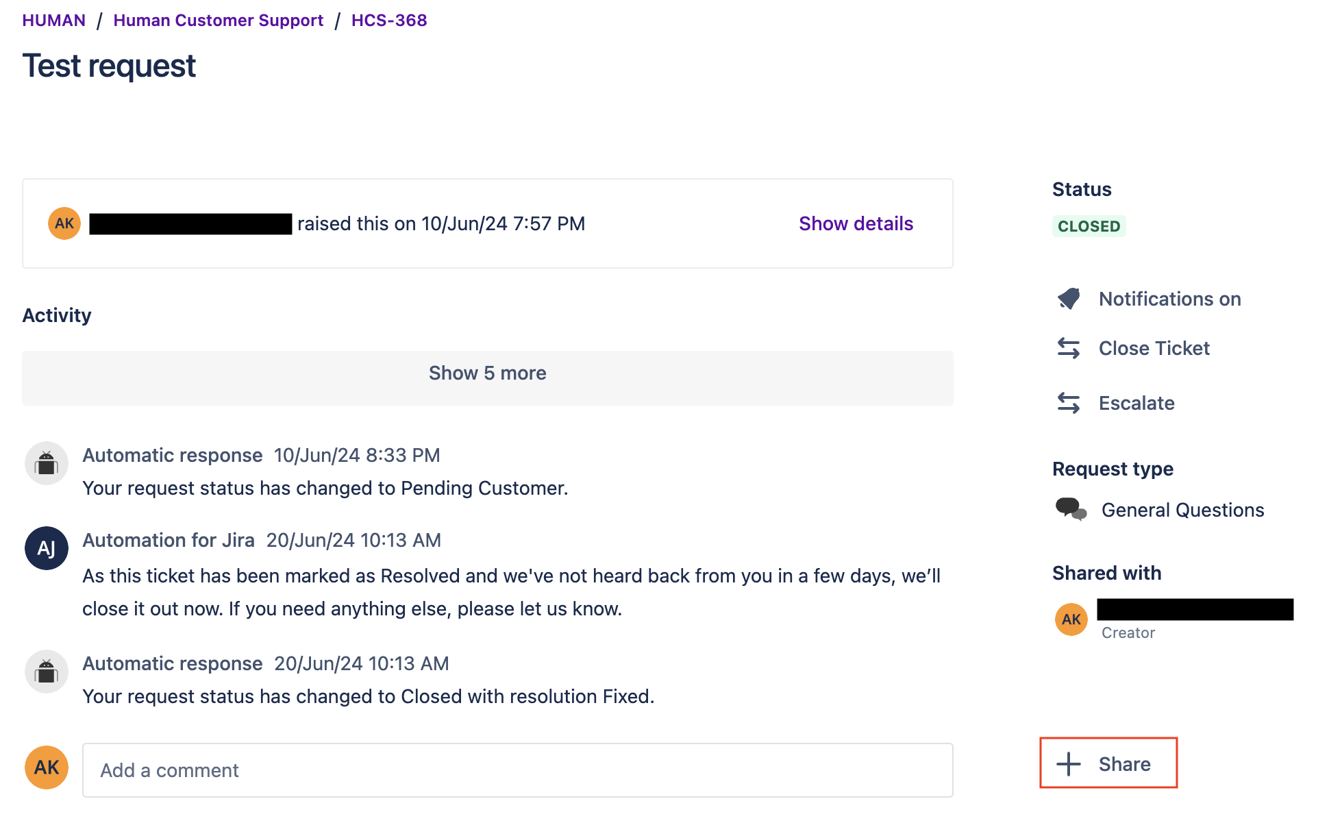 - At the bottom of the ticket, select + Share.